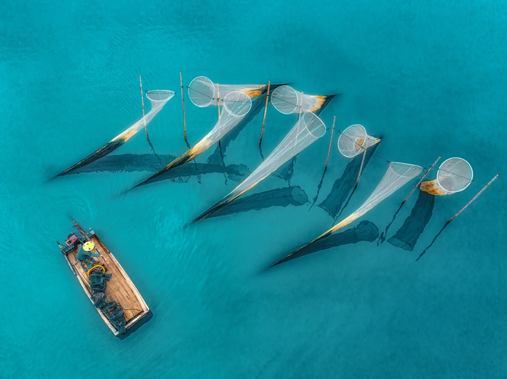 晨光中,渔人摇动渔船,涟漪荡开水纹,劳作与诗意在粼粼波光间交织成一幅静谧的水墨画卷,定格着向海而生的永恒瞬间。