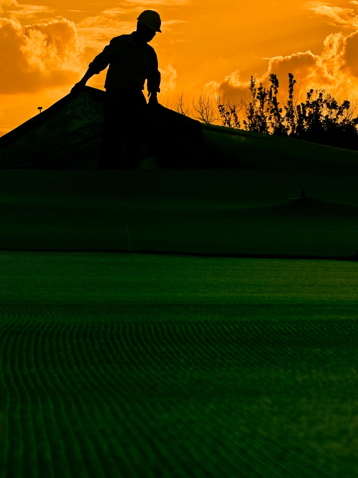 黄昏时分,工人弯着腰把绿色防草布铺满草地。这块布像条大被子,慢慢盖住金黄的天空,天色渐渐变深蓝。他直起身子擦汗时,夜幕正从布纹里渗出来,把最后一点亮光收进被角。