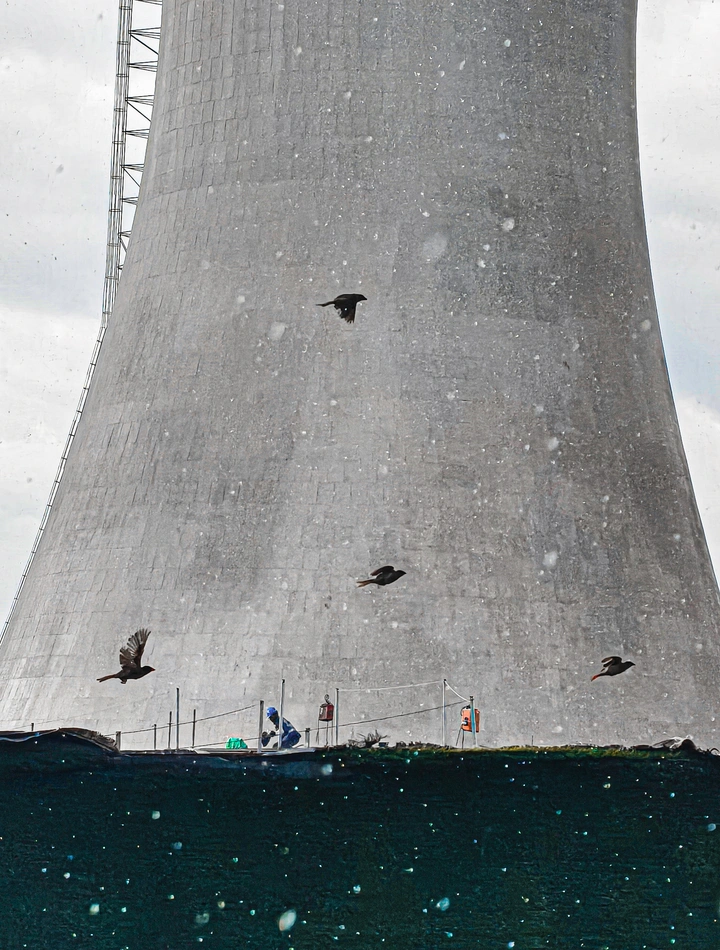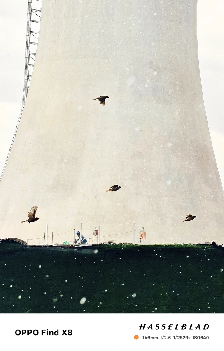 细密雨幕中,冷却塔如巨兽蛰伏,工人俯身作业。四只鸟儿掠过灰白混凝土,翅膀划开清冷空气。工业冷峻与自然灵动在雨丝里交织,奏响无声的时空乐章。