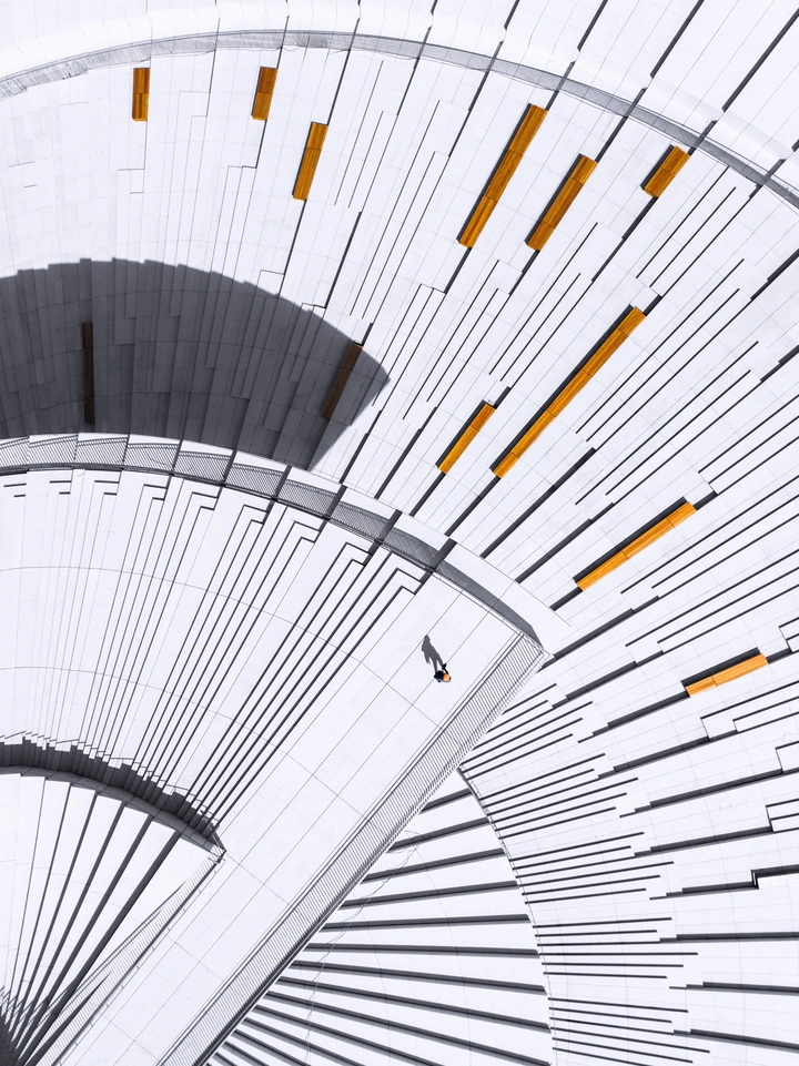 无人机掠过上海大歌剧院螺旋穹顶,扇形阶梯如巨型折扇缓缓展开,工人身影点缀其上,现代建筑美学与东方韵味在云端交织成诗。
