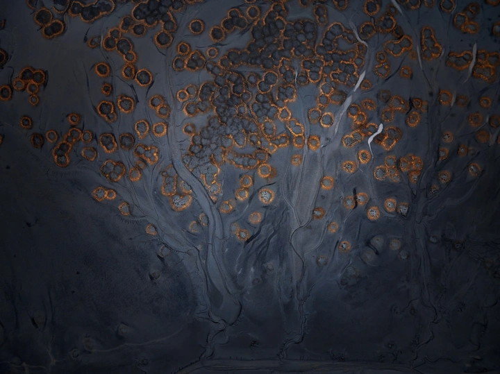 潮汐退去,滩涂上“潮汐树”拔地而起——深灰枝干蜿蜒如古木,橙黄环状纹饰缀满枝桠,恰似摇钱树垂落金穗。潮水每涨落一次,便在枝杈间“结”出新的“钱币”,光影流转中,自然之力与财富意象交织,绘就大地馈赠的生态奇观。