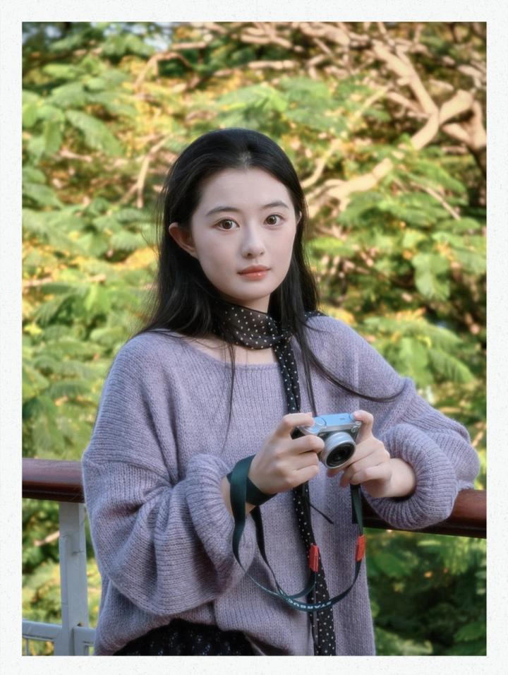 秋阳滤过叶隙,将紫绒针织浸成淡雾。 她以掌间相机为舟,泊于木阶、凭于栏栅.任风绾起发梢时,取景框里的每一帧,都是光阴轻叩温柔的回声