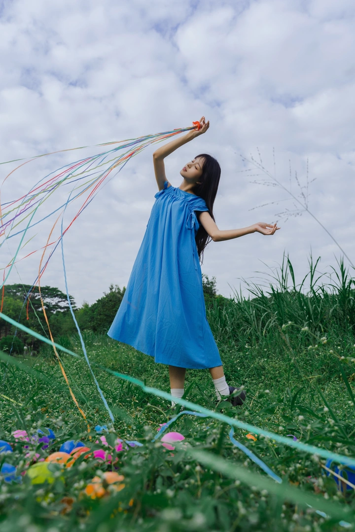 风拂青野,蓝裙漫舞