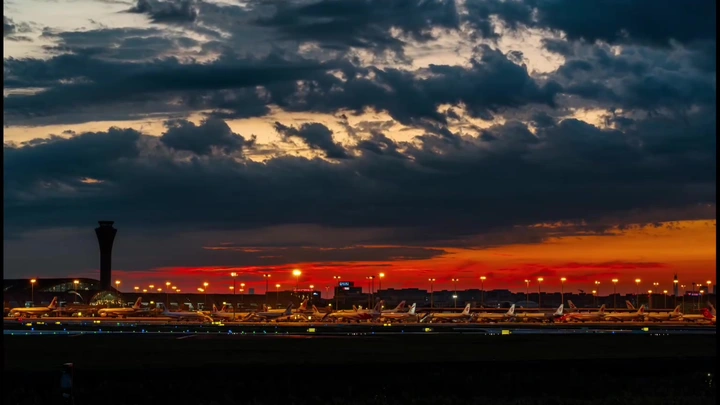 朝霞将天际晕染成热烈的橘红,与机场的灯火温柔交织,勾勒出别样的浪漫与诗意。 飞机安静地停靠在机位,仿佛也在沉醉于这片刻的美好,等待着下一次承载梦想与期待的起飞。
