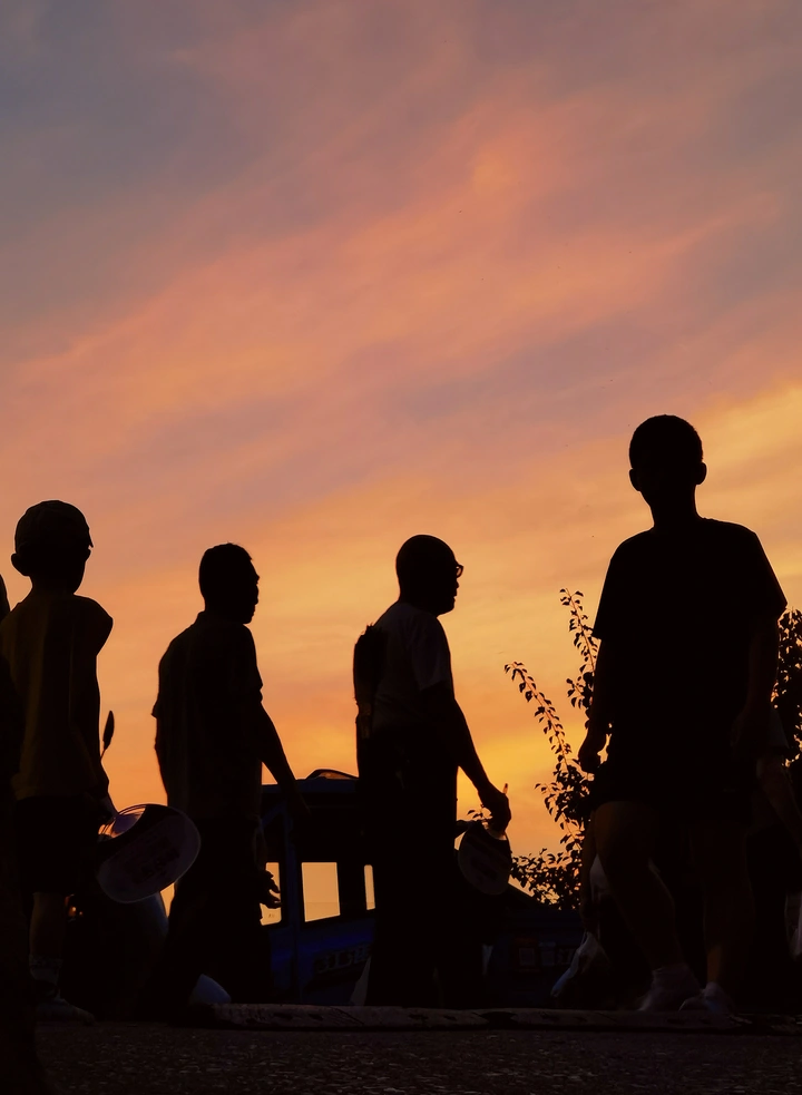 夏日的夕阳余晖染得天空一片绚烂,行人剪影错落漫步,树影婆娑间,暮色温柔包裹着人间烟火。