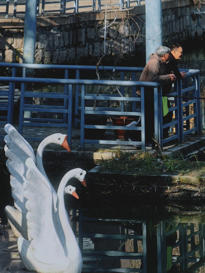暖光洒落,三尊天鹅雕塑好似聆听絮语;栏杆旁二老闲叙,石墙、水面与光影交织成悠然岁月的静谧画面。