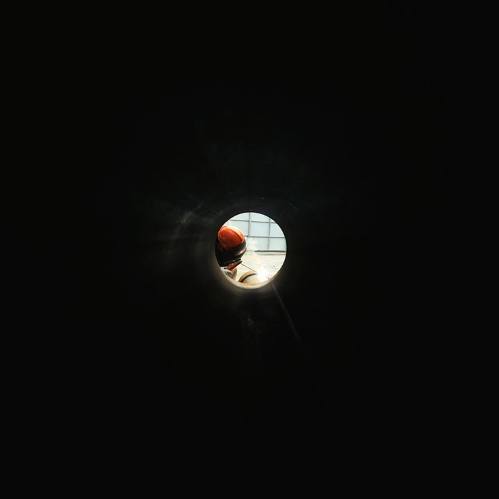 钢管内壁的幽暗框住头戴橙红安全帽、面罩遮面的电焊工,焊花迸发的流光穿透黑暗,与背景厂房的轮廓交织,定格施工现场里专注而炽热的劳作瞬间。