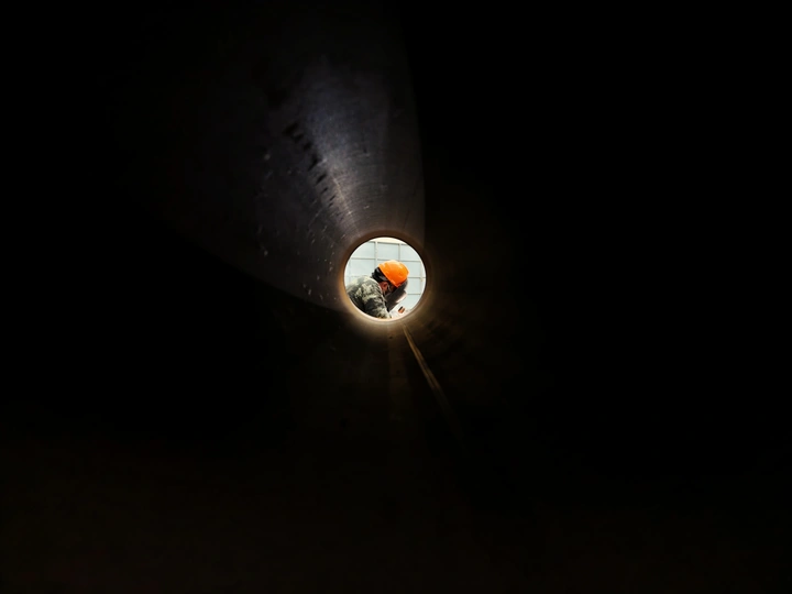 幽暗管道尽头,橙色安全帽在光圈中格外醒目,焊工专注作业的身影,是平凡劳动岗位上最动人的光芒。