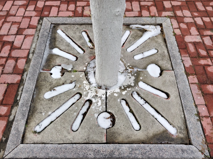 白雪轻填石缝,红砖映衬灰阶,树根旁的几何纹路如冬日低语,静谧中透着设计巧思与自然的温柔邂逅。