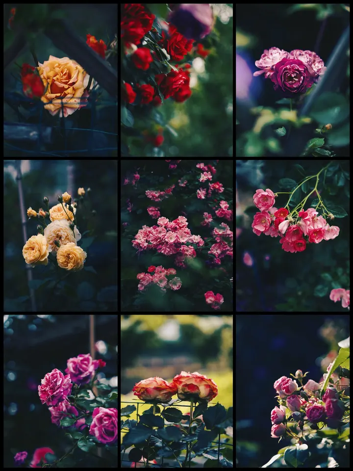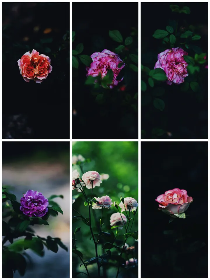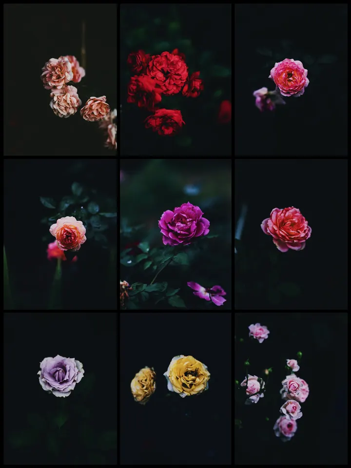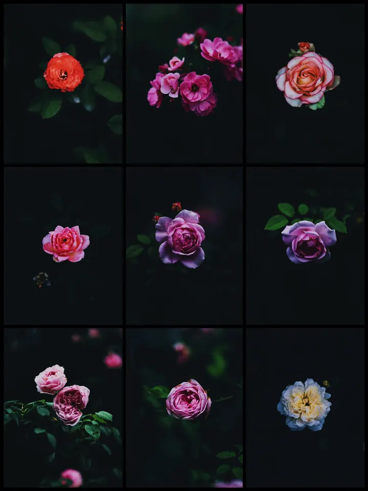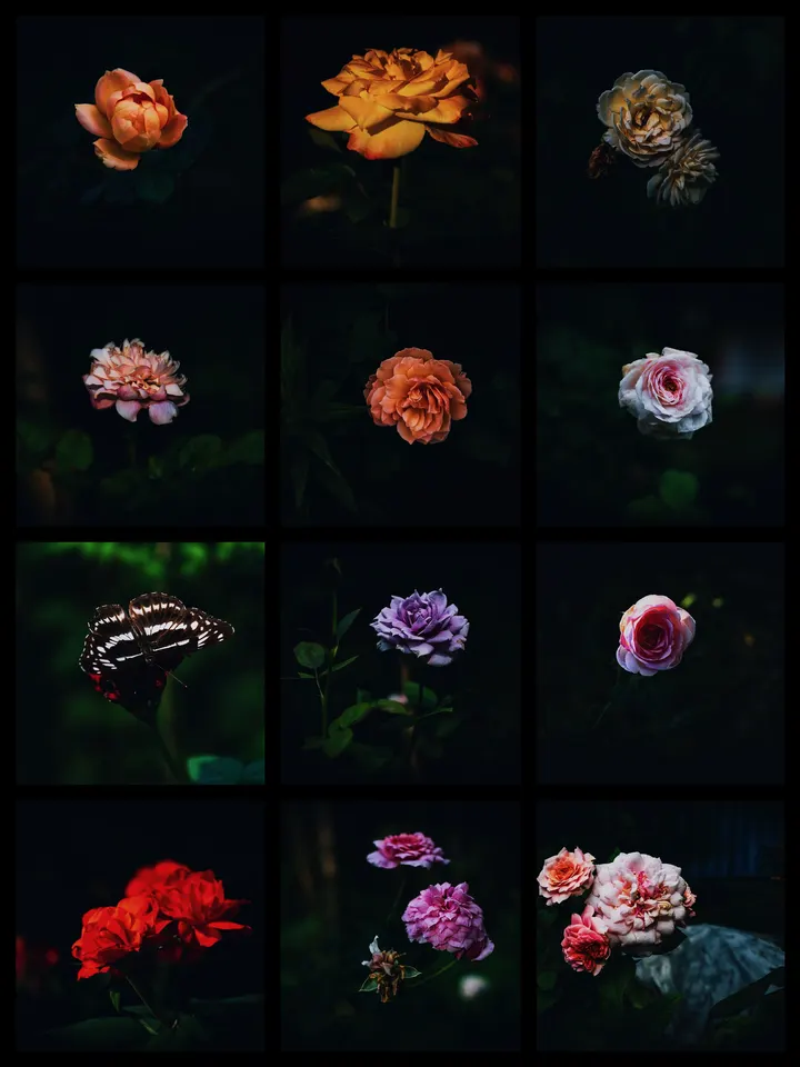 在暗色背景的衬托下,月季与蝴蝶肆意绽放。不同色彩、形态的花朵,是自然写就的浪漫诗行,每一朵都藏着独属于自己的温柔故事,邀你共赏这份暗夜繁花的静美。