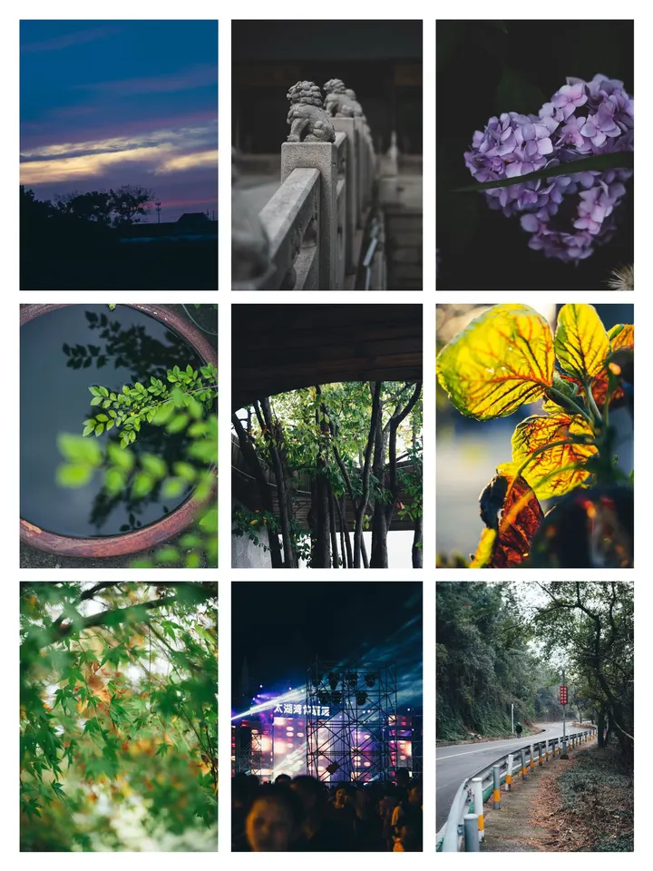 镜头里的每一寸光影,都是生活写给我的情书💌 • 暮色四合时,天空晕染成温柔的紫,像打翻了的莫奈调色盘🌄 • 古桥的石狮子,在时光里静静守护着一方烟火🏯 • 绣球花在暗夜里盛放,紫色的温柔藏在每一片花瓣里💜 • 缸中的倒影,是枝叶与水的私语,安静得能听见心跳🌿 • 秋意渐浓时,叶片在阳光下燃烧,像把整个秋天的热烈都揉进脉络里🍂 • 音乐节的霓虹与欢呼,是青春最滚烫的注记🎸 • 蜿蜒的公路通向远方,每一步都是奔赴自由的脚步🚶♀️