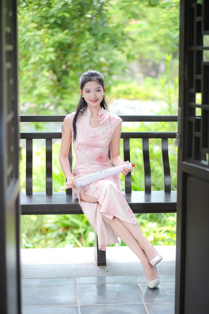身穿优雅的粉色旗袍, 细腻的光影下尽显江南的温柔婉约, 一回眸间透着静谧雅致的东方韵味 , 每一个细节都在诉说温柔。