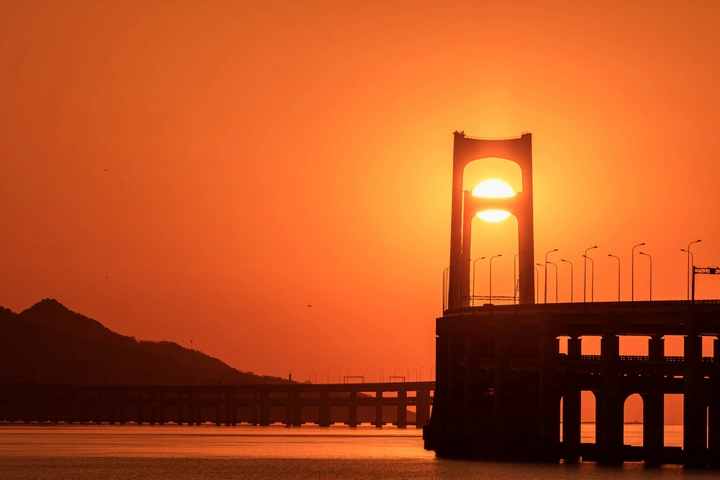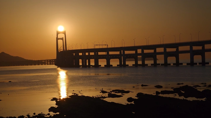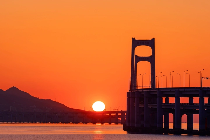 当第一缕橘色霞光吻醒星海湾,整座城市还沉在温柔的睡意里。太阳从跨海大桥的桥拱间缓缓升起,把天际线晕染成滚烫的橙红,连海面都铺成了流动的碎金。 大桥的轮廓在晨光里愈发清晰,立柱与灯杆的剪影,像为这场日出特意搭起的画框。远处的山峦沉在雾色里,近处的水波轻轻晃着光,风里带着海的咸湿,混着日出独有的暖意。 这一刻,时间仿佛慢了下来,所有喧嚣都被橘色的光温柔包裹。星海湾的日出,是写给大连的一封情书,把清晨的浪漫,藏进每一缕洒向海面的阳光里。 @米拍社长 @米拍小助手 @米拍编少 @米拍