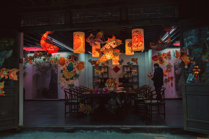 古檐之下,满室鸢灯流光溢彩。锦鲤风筝悬于梁间,似要跃出纸面;剪纸灯笼暖光融融,映得满室生春。木桌古椅静立,匠人执鸢而立,指尖流转着千年的匠心。风过似有鸢鸣,灯影摇曳间,传统之美在烟火气里缓缓流淌,一眼便撞进了中式浪漫里。