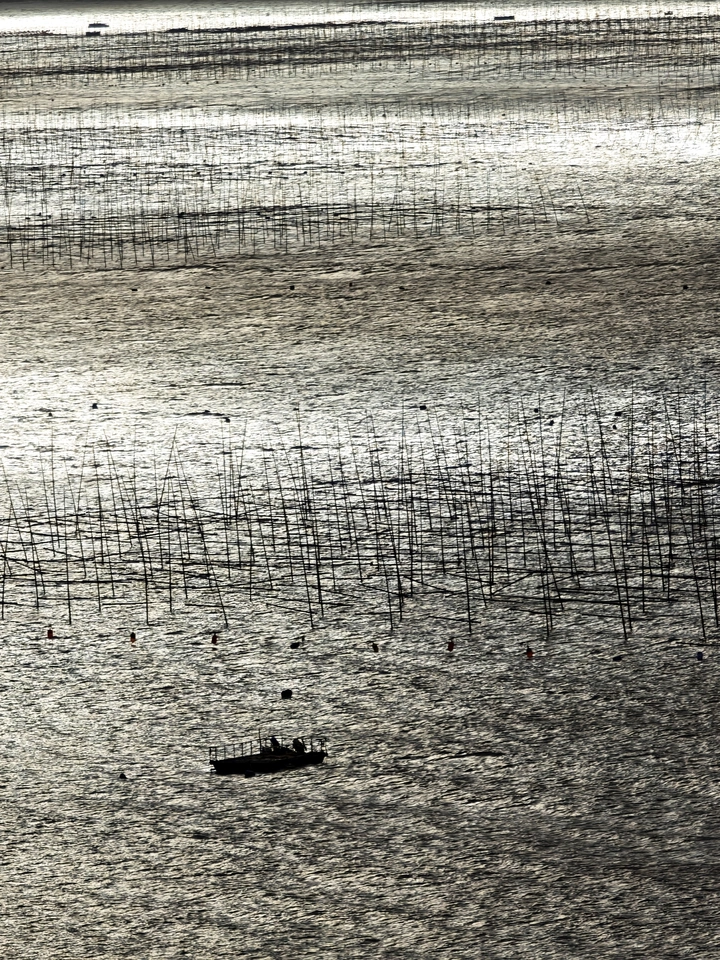 这片滩涂是天地挥毫的水墨长卷。潮滩上的竹竿如万千墨线,在水泽间纵横写意,或密或疏,勾勒出东方留白的气韵。小舟似墨点游弋,渔民是画中的灵动笔触,于氤氲水汽里晕染出渔事的烟火诗意。这里的每一处线条、每一缕光影,都在潮汐的韵律中写意出山海与人文的缠绵,似一首无声的渔歌,在水墨氤氲间悠悠回荡,道尽霞浦滩涂“水天作纸,潮汐为墨”的东方意境。