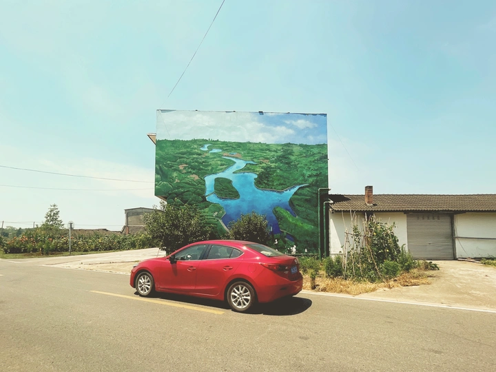 偶然走进一个村子,村子里的河流被画在墙上,红色的汽车经过河流驶向远方。 📱iPhone
