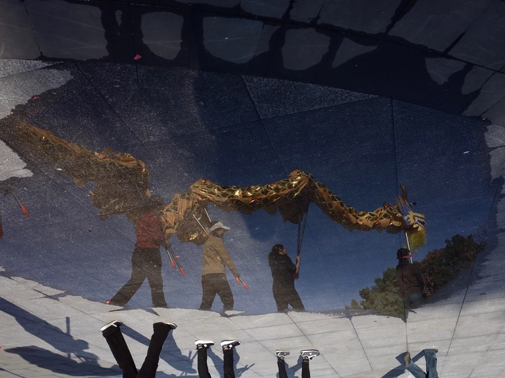 春节中的舞龙活动,因为刚好倒映在水里,显得非常有趣。