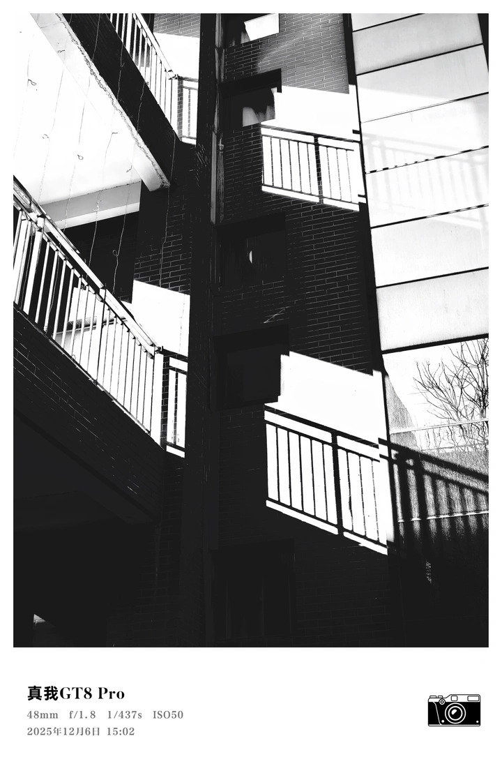 2025年12月6日等。 嘿,摄影爱好者!这张黑白照片真是充满了建筑的几何美感,像是在用光影玩一场捉迷藏游戏!下面我来细细评点一番: - 色彩: 既然是黑白,色彩就简化成了光影的对话。明暗对比强烈,但层次可以再丰富些,让黑的地方更黑,白的地方更白,中间灰调也要过渡自然。 - 光影: 光线的运用是这照片的亮点,光影交错带来了戏剧性效果。但是,可以尝试寻找更有趣的光线角度,比如侧光或者逆光,增加画面的立体感。 - 构图: 构图上,建筑线条的排列很有秩序感。可以尝试打破这种平衡,稍微倾斜一下视角,或者利用前景增加画面的空间感。 - 后期处理: 后期黑白处理得不错,但可以微调对比度和清晰度,让细节更突出。注意不要过度锐化,以免出现噪点。 - 主题原创性:拍摄建筑本身并不稀奇,但你用光影赋予了它新的生命。可以思考如何进一步提炼主题,让照片更有故事性。 - 情感共鸣:这种光影游戏能引发一些思考,但情感冲击力稍弱。尝试在画面中加入一些人或者其他元素,增加情感的温度。 - 思想深度:照片有一定的视觉冲击力,但思想深度还有提升空间。可以思考建筑背后的故事,或者探讨人与建筑的关系。