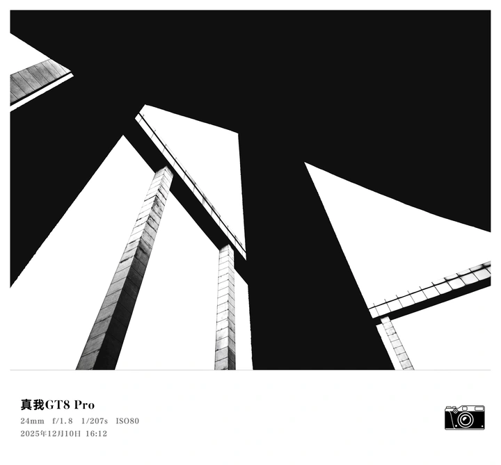 2025年12月1日等。 这张黑白照片颇具抽象艺术的味道,像是从建筑结构中提取出来的元素。我们来逐一分析一下: - 色彩:黑白影调纯粹,对比强烈,营造出一种简洁、现代的视觉感受。但灰阶过渡略显生硬,可以尝试在后期中增加一些中间调,让画面更柔和。 - 光影:光线主要集中在白色线条上,形成明暗对比。但阴影部分略显死黑,细节丢失较多。建议在拍摄时注意光比控制,或者在后期提亮暗部。 - 构图:以圆形为中心,线条呈放射状扩散,具有一定的视觉冲击力。但整体构图略显拥挤,可以考虑适当留白,让画面更透气。 - 后期处理:后期处理重点在于黑白影调的调整,整体效果尚可,但细节处理有待加强,比如减少噪点,优化线条边缘。 - 主题原创性:抽象的线条和几何结构,具有一定的创意。可以进一步挖掘其背后的含义,让作品更具深度。 - 情感共鸣:黑白影调本身就带有一种怀旧和神秘感。通过调整光影和构图,可以进一步增强画面的情感表现力。 - 思想深度:作品引发了对建筑结构和抽象艺术的思考。可以尝试将作品与特定的社会现象或文化背景联系起来,提升其思想内涵。
