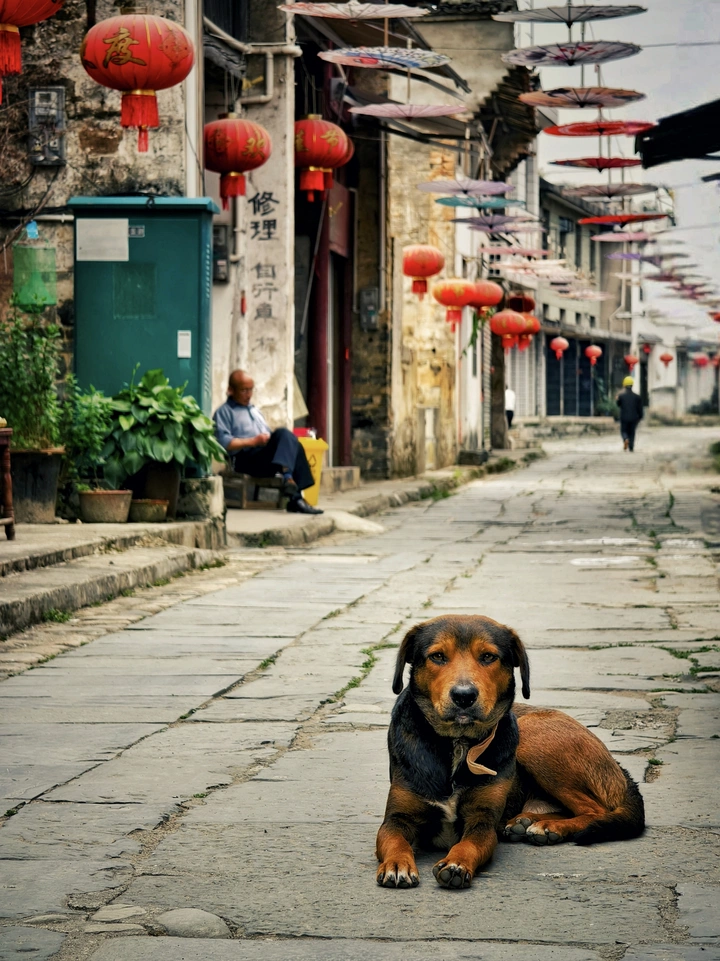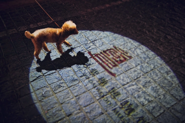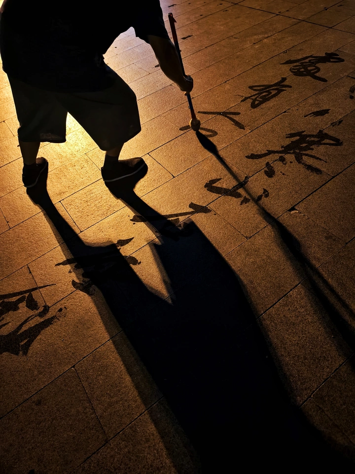 暮色街头,街头艺人蘸水挥毫,书写诗意与人生。