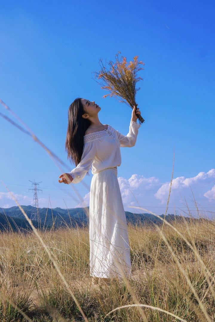 旷野有风,吹皱了冬草,也吹软了心事。白裙与荒草相拥,风里全是冬日的温柔。
