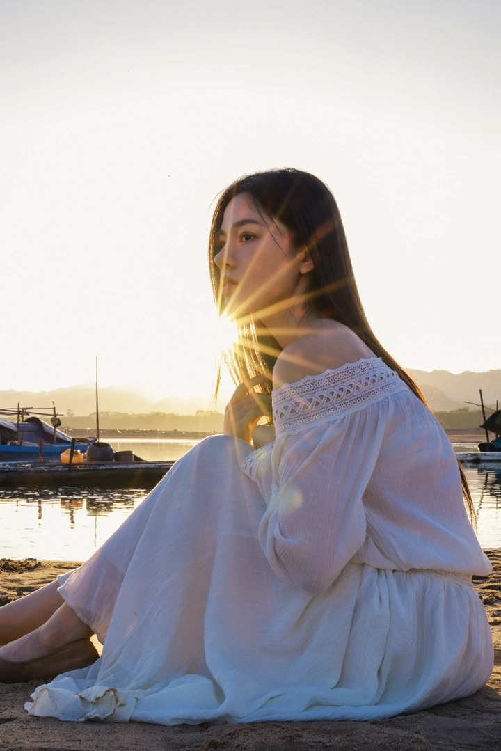 落日吻过江岸线,晚风揉碎了江波,白裙沾了一身温柔的橘。