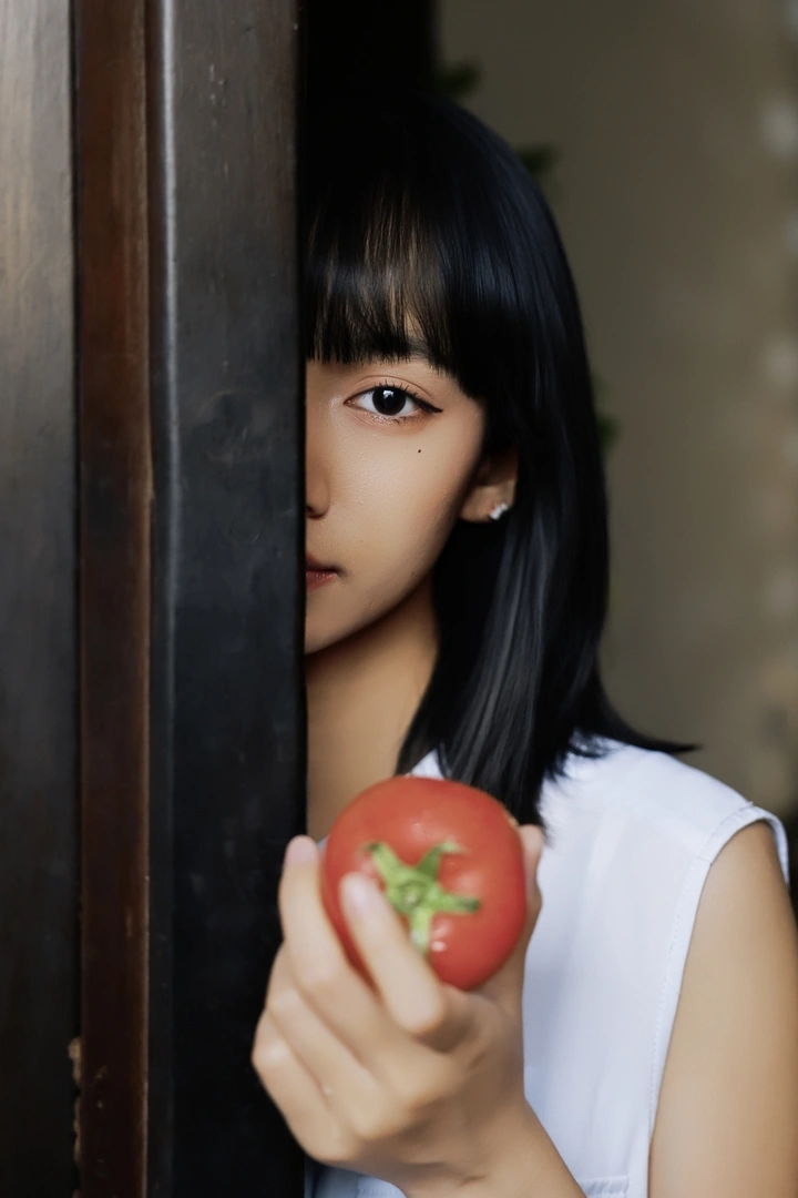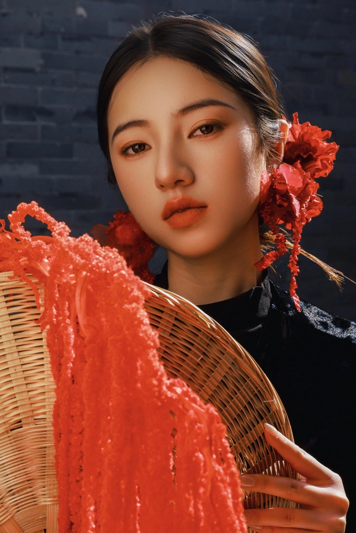 檐下听风,朱影入廊。 丝绒裹身,斗笠藏光。 在青瓦白墙间,拾一段东方旧梦。