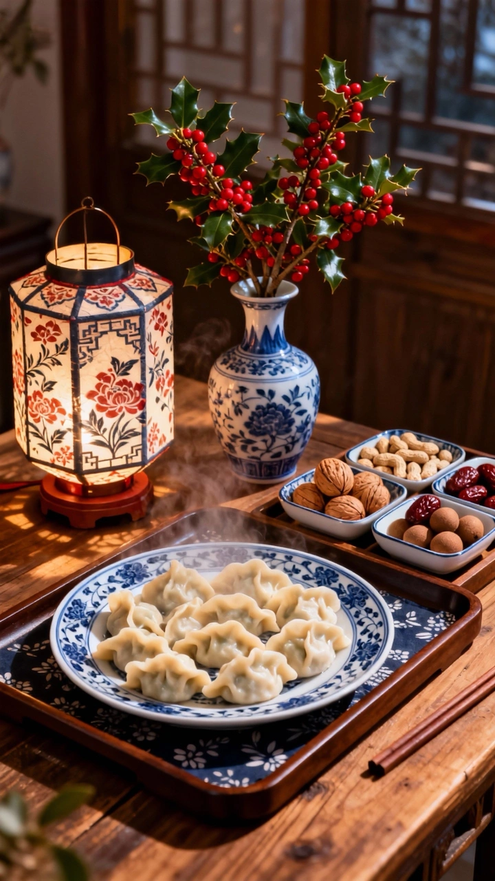 窗格筛下的暖光,揉皱了青花的纹 红果坠在枝桠,结出冬的印章 蒸汽漫过瓷盘,裹着饺子的温香 把中式的浪漫,封进这方木桌的时光 灯笼摇着福字,晃落细碎的暖 核桃与花生,卧着岁月的甜 青花瓷瓶立着,盛住一整个冬天的团圆 烟火入味时,冬至便有了温柔的模样