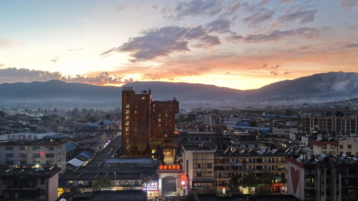 晨雾裹着城市半梦半醒,高楼像浸在云里的糖块,连烟火气都软乎乎的。