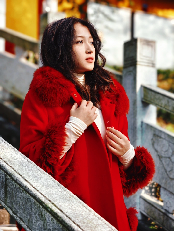 朱砂红大衣拂过青石阶,黄墙古寺的禅意漫上肩头,风穿过雕栏,把东方的雅致揉进这一帧光影里。