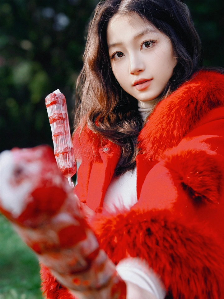 这红红的大衣和甜甜的棒棒糖给寒冷的冬季带来了一丝暖意。