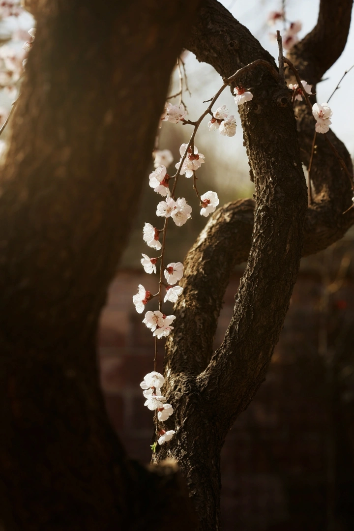 一枝垂落的杏花在老树的怀抱里轻绽,一半是深褐的苍劲沉稳,一半是粉白的轻盈温柔,光影交错间,刚与柔相拥。枯木孕芳华,春意漫枝头。
