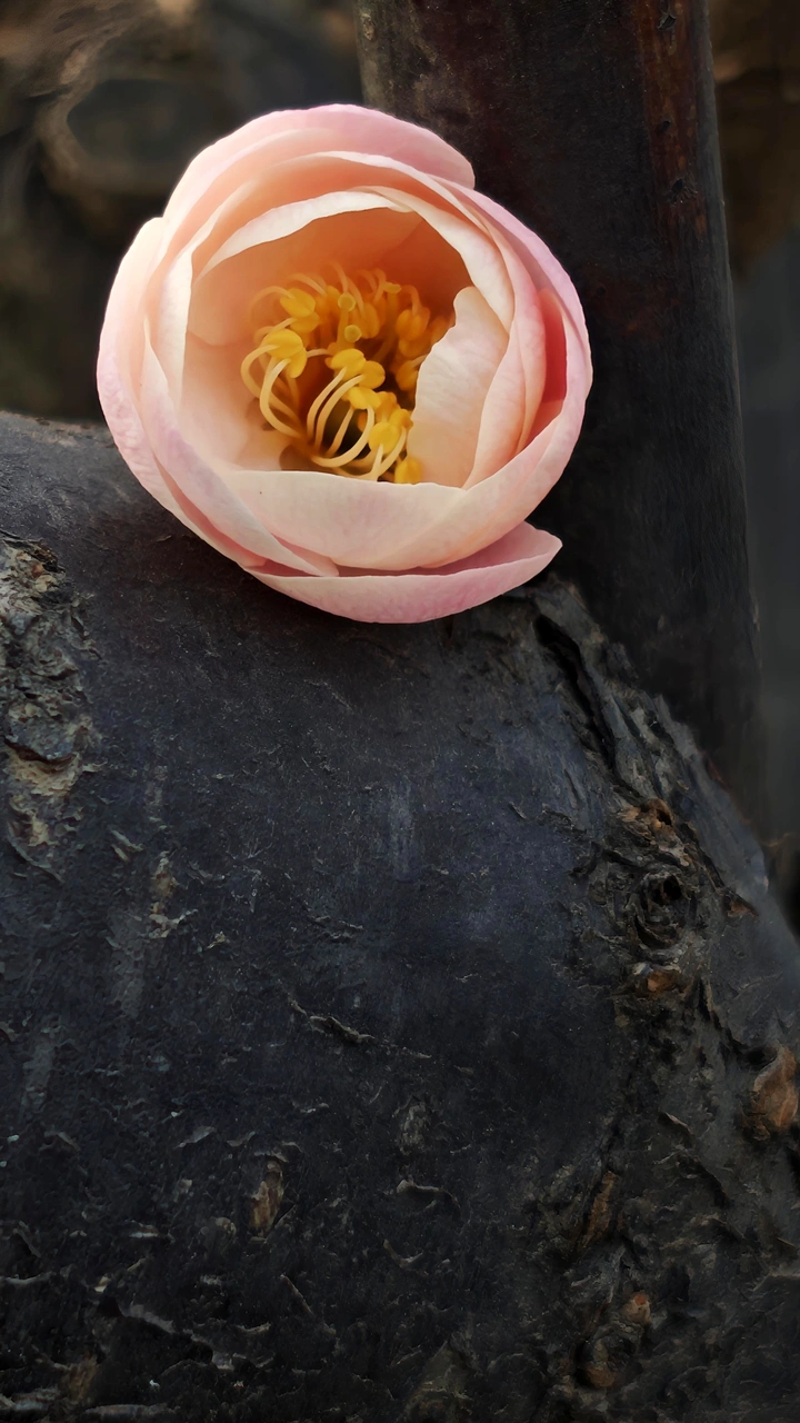 裂纹遍布宫粉梅的古桩上,一朵新蕊初萌,在沧桑的底色上点亮一抹灼灼的娇艳!