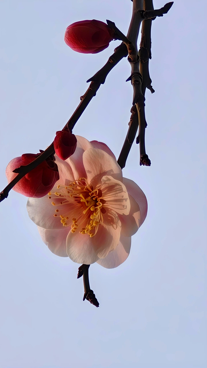 把月光柔碎了,掺半分胭脂,便成了这枝上的宫粉。微风吹过,连呼吸都带着清冽的甜!在寒冷的冬季,开得最热烈的粉霞,温柔里都带着锋芒。