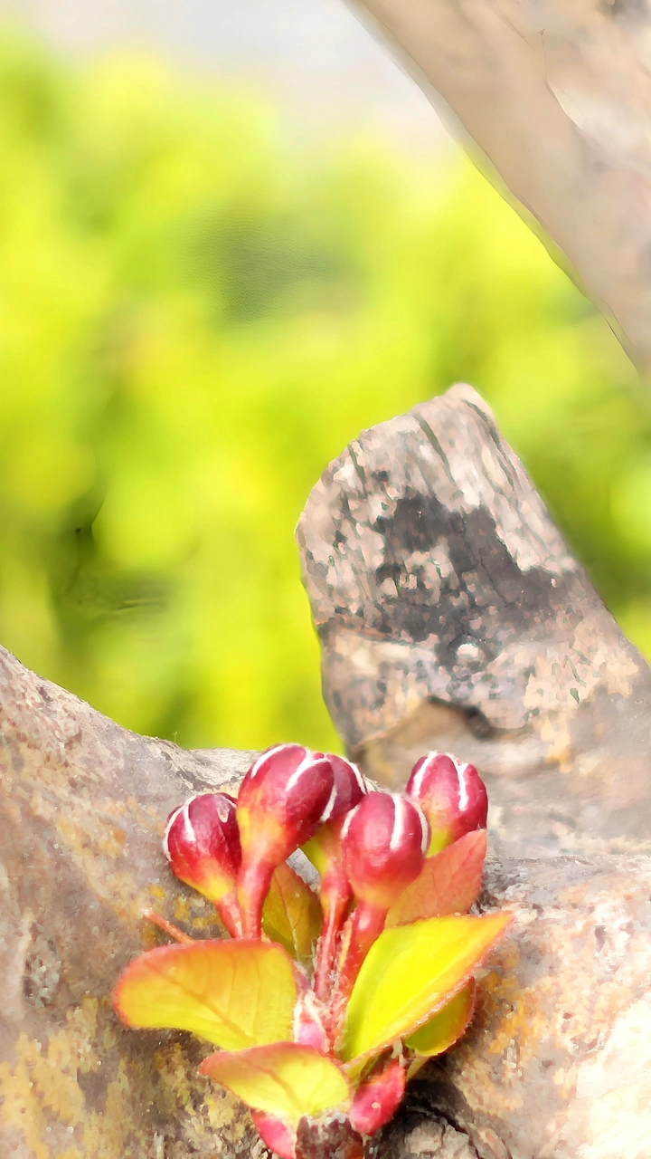 枝桠间,几颗红胭凝脂的花苞,裹着春的是诗语,静待花开!