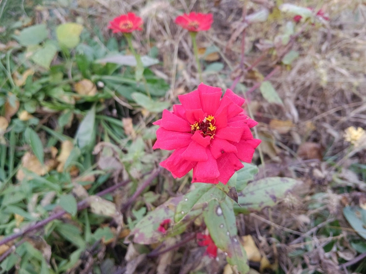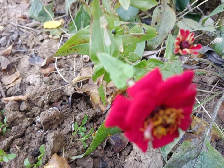 红瓣间的秋野心跳 褐土与残叶织就的秋隙里,这朵炽红百日菊以绒软的瓣、蜷簇的蕊,撞开了荒寒的沉寂。 它的瓣色浓得灼目,像把晚霞的炽艳揉进了绒纹,蕊间金绦蜷成细簇,沾着星点残屑,连那只栖在瓣上的小虫,都成了热烈里的温柔注脚。细茎斜撑着,把红抬出枯屑的围裹,身后半谢的花影,更衬得这抹红像秋野的心跳——没有刻意避开萧索,只以最本真的舒展,把暖浸进凉隙。 风过,瓣尖轻颤如焰尖抖落的光,把热烈揉进了野地的软。这朵菊是秋的诗人,以炽红为墨、以褶皱作纸,写着关于孤勇与温柔的短章:它的美从不是盛时的灼目,是荒寒里醒着的韧,是杂影间藏着的暖。 原来生命最动人的姿态,从不是被呵护的精致,是带着烟火气诚恳生长——哪怕身处荒寒,哪怕沾着细尘,也要把自己活成一束醒目的光,这便是红瓣间藏着的、最朴素也最深刻的秋野真意。