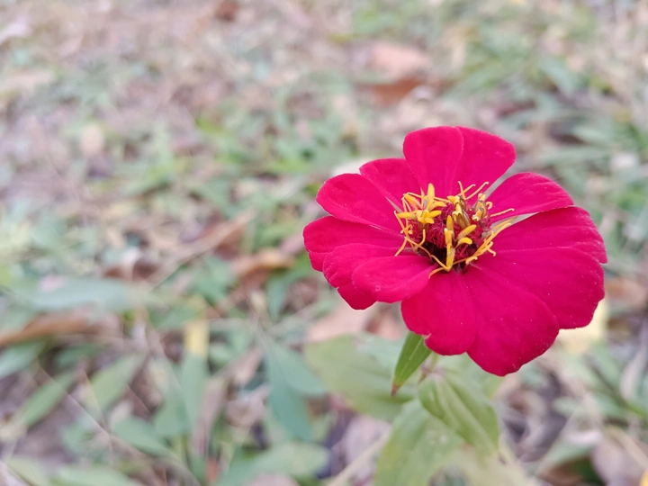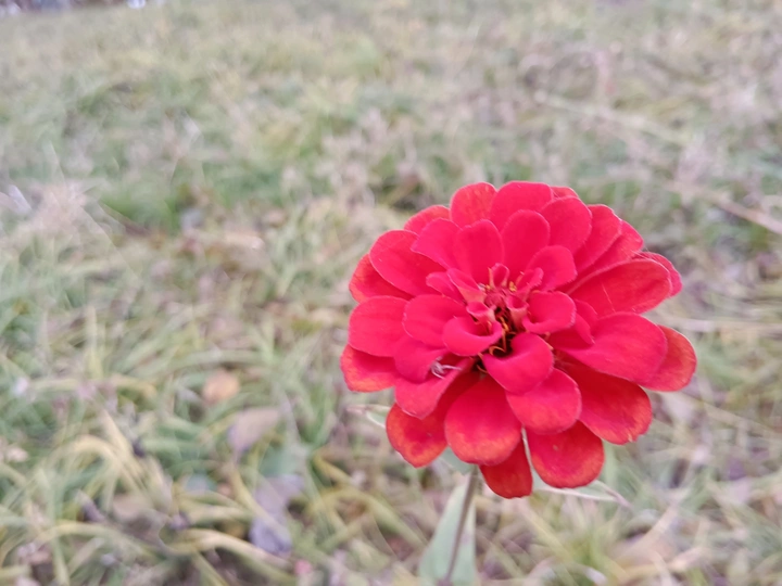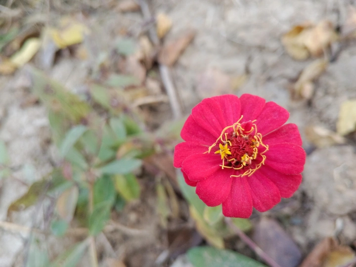 炽红绒瓣里的生命真味 秋野的土隙间,这朵炽红百日菊以绒软的瓣、蜷簇的蕊,织就了生命最鲜活的隐喻:热烈从不是喧嚣的专属,沉默的盛放,本就是对生活最诚恳的应答。 它的瓣色浓得匀净,绒纹间沾着细如星屑的尘,却把这烟火气揉进了炽艳里——没有刻意与周遭的荒寒划清界限,它就那样坦荡地立在褐土与残叶间:风掠过,瓣尖轻颤如焰尖抖落的光,连沾着的尘都成了热烈里的温柔注脚;露凝时,它便承着润,把凉裹进暖的褶皱,在枯屑围裹的隙里,把每一寸舒展都活成“接纳”。 中心金蕊蜷成细簇,蜷曲的丝绦沾着星点残屑,却丝毫不减生机。这让我想起生活里那些沉默的耕耘者:他们不执着于遮掩职场的磕碰、生活的褶皱,只把这些“不完美”当成生命的纹理,在平凡的境遇里,以最本真的姿态盛放。 这朵菊的美,从不是温室里的精致,是荒野间沉默的热烈。它让我们懂得:生命的珍贵,从不是活成万众瞩目的焦点,而是带着烟火气诚恳生长——哪怕身处荒寒,哪怕沾着细尘,也要把自己活成一束自洽的光,这便是炽红绒瓣里藏着的、最朴素也最深刻的生命真味。