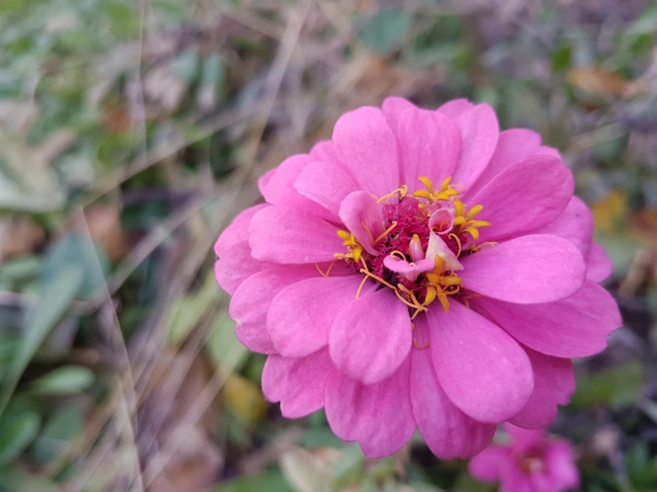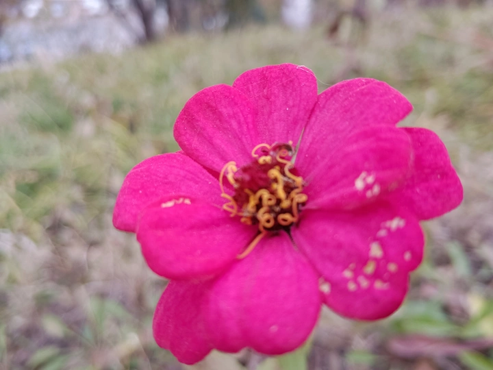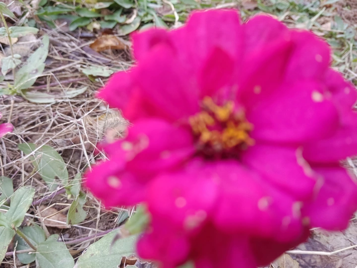 玫红瓣上的秋之诗 软草与枯屑缠成的秋雾里,这朵玫红百日菊以带星点白痕的瓣,织就了荒寒里的暖。 瓣色浓得灼目,绒纹裹着细尘,那些浅白的点是虫与风的轻吻——它没藏起这些细碎的“痕”,反而把它们揉进舒展的瓣间:细茎斜撑着,让玫红从杂影里探出来,蕊间金绦蜷成蜷曲的簇,沾着星尘却依旧漾着生机。 风过,瓣尖轻颤如暖光抖落,连白痕都成了温柔的注脚。这朵花是秋的诗人,以玫红为墨,写着关于柔与韧的短章:它的美从不是无瑕的盛,是碎隙里醒着的光,是荒芜中撞开的软。 原来生命最软的欢喜,从不是惊艳的鲜,是残瓣里裹着的韧——哪怕秋意渐凉,这抹玫红仍把自己活成荒丛里的诗,让人心底漫起对平凡生机的敬。
