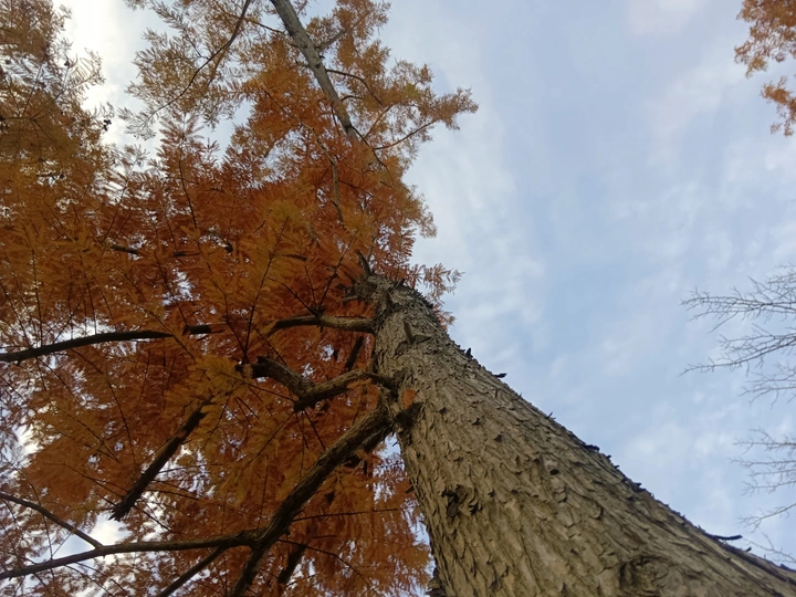 橙枝间的秋之焰 仰头时,这棵树把秋的炽艳织进了云隙——褐纹皲裂的干,撑着满枝橙焰,像把晚霞揉进了梢头。 细羽似的叶裹着浓橙,从梢尖往枝桠渐染成浅金,风过处,叶簇轻颤如焰尖抖落的星,把云影都浸成了暖的波纹。糙皮的干上,疤结是岁序刻下的印,却让这炽艳多了层沉实的韧:它没有刻意遮掩岁月的痕,只以满枝橙焰,把秋的萧索烧成了热烈的诗。 这树是秋的诗人,以橙叶为墨、以疏枝作笔,写着关于凋零与盛放的短章:叶的橙从不是落幕的颓,是生命把积攒的暖,在岁寒前燃成最艳的光;干的糙也不是沧桑的叹,是岁月把沉淀的韧,织成托举热烈的脊。 风裹着叶的暖掠过肩头,才懂这树的真意:生命最动人的姿态,从不是盛时的葱茏,是凋零前把自己烧成一束焰——哪怕云影渐凉,哪怕岁序向寒,也要把暖铺展成秋的醒,让人心底漫起对时光炽烈的敬:原来告别从不是冷的句点,是暖的诗行,是橙枝间藏着的、最热烈的秋之礼。