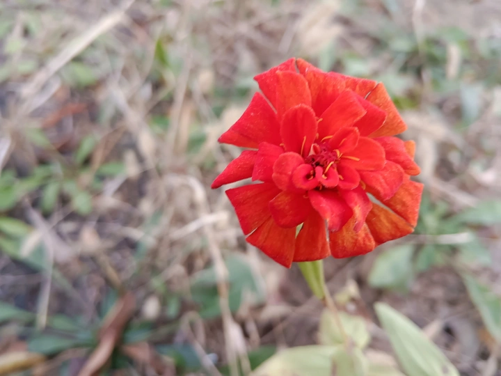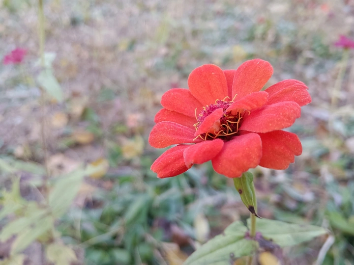 炽红瓣上的生命张力 当这朵炽红百日菊以舒展的瓣、蜷簇的蕊立在荒丛间,它便成了秋野里最生动的生命注脚:热烈从不是完美的专属,坦荡的盛放,本就是对生活最有力的回应。 它的瓣色浓得灼目,像把残阳的余温都揉进了绒纹,中心金蕊蜷成细簇,蜷曲的丝绦沾着细尘,却丝毫不减生机——没有刻意遮掩与周遭荒寒的违和,它就那样坦荡地把红铺展成野地的醒:风过,瓣尖轻颤如焰尖抖落的光,连沾着的细尘都成了热烈里的烟火气;雨落,它便承着露的润,把凉裹进暖里,在枯屑围裹的土隙里,把每一寸肌理都活成“接纳”。 这让我想起生活里的我们:总执着于把“瑕疵”藏在身后,却忘了像这朵菊般——职场的磕碰是成长的纹理,生活的褶皱是鲜活的凭证,那些不完美的痕迹,本就是生命张力的来源。 这朵菊的美,从不是温室里的精致,是荒野间坦荡的热烈。它让我们懂得:生命的珍贵,从不是活成无懈可击的标本,而是带着烟火气坦荡盛放——哪怕身处荒寒,哪怕沾着细尘,也要把自己活成一束醒目的光,这便是炽红瓣上藏着的、最朴素也最深刻的生命智慧。