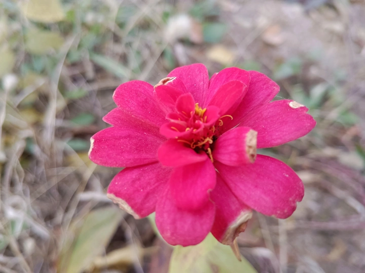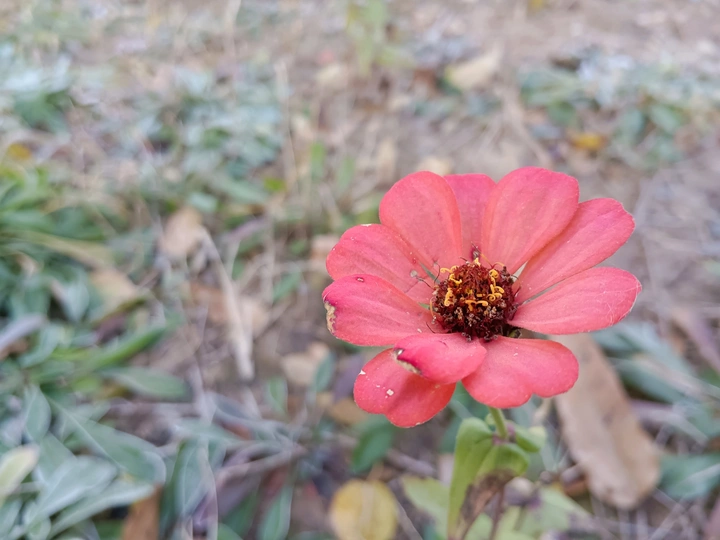 残瓣里的绯色暖 褐土与枯茅织就的秋隙间,这朵绯色百日菊以带痕的瓣,撞开了荒寒的沉寂。 瓣色是柔润的绯,从芯处往边隅漫开,瓣尖的褐疤、星点的白屑,是风与虫的轻吻——它没藏起这些“不完美”,反而把痕揉进舒展里:细茎斜撑着,让绯色从杂影里探出来,蕊间金绦蜷成深褐的簇,沾着尘却依旧漾着生机。 风过,瓣尖轻颤如暖光抖落,连疤痕都成了温柔的注脚。这朵花是秋的诗人,以残绯为墨、以褶皱作纸,写着关于韧与暖的短章:它的美从不是无瑕的盛绽,是碎隙里醒着的软,是荒芜中藏着的光。 原来生命最动人的姿态,从不是被呵护的精致,是带着伤痕诚恳生长——哪怕秋雾渐浓,这抹绯色仍把自己活成荒丛里的诗,让人心底漫起对平凡生机的敬:所谓圆满,从不是无瑕的单一,是与不完美共生的妥帖。