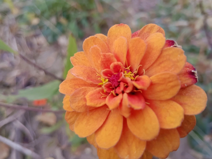 秋隙里的橙焰 荒丛间,这朵百日菊裹着橙与红的叠瓣,像揉碎的夕照落进了秋。 瓣边沾着浅褐的痕,却把暖浸得更沉——细茎撑着叠瓣,蕊间金绦蜷成簇,风过处,软颤如焰尖抖落星子。 它不躲萧索,只把自己活成秋隙里的醒:这暖不是盛时的灼,是荒寒中撞开的光,让平凡的野地,漫起细碎的欢喜。