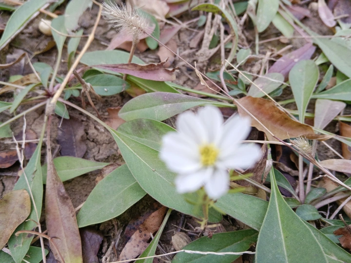 荒丛的杂绿与残叶间,这朵素白小花擎着金蕊,像落进秋隙里的星。