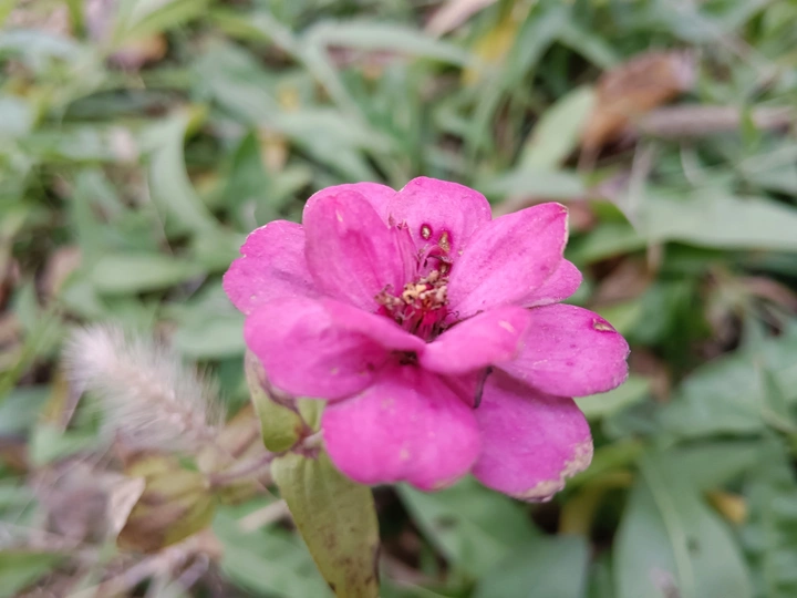残瓣里的玫红暖 枯茅缠成的秋隙间,这朵玫红百日菊以带褐边的瓣,织就了荒寒里的暖。 瓣色浓得匀净,绒纹裹着细尘,瓣尖的褐痕是风与虫的吻痕——它没刻意藏起这些“不完美”,反而把痕揉进舒展里:细茎斜撑着,让玫红从枯屑间探出来,蕊间金绦蜷成簇,沾着星点残屑却依旧漾着生机。 风过,瓣尖轻颤如暖光抖落,连褐边都成了温柔的注脚。这朵菊是野地的诗人,以残红为墨,写着关于柔与韧的短章:它的美从不是无瑕的盛,是碎隙里醒着的暖,是荒芜中撞开的光。 原来生命最软的欢喜,从不是惊艳的鲜,是残瓣里裹着的韧——哪怕秋意渐凉,这抹玫红仍把自己活成荒丛里的诗,让人心底漫起对平凡生机的软敬。
