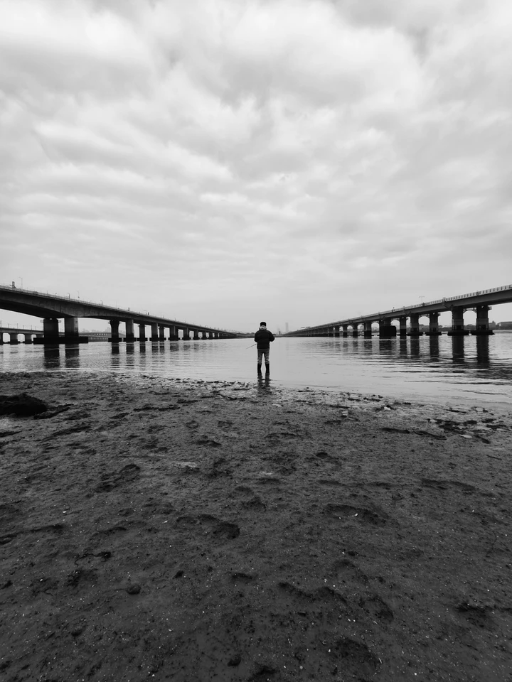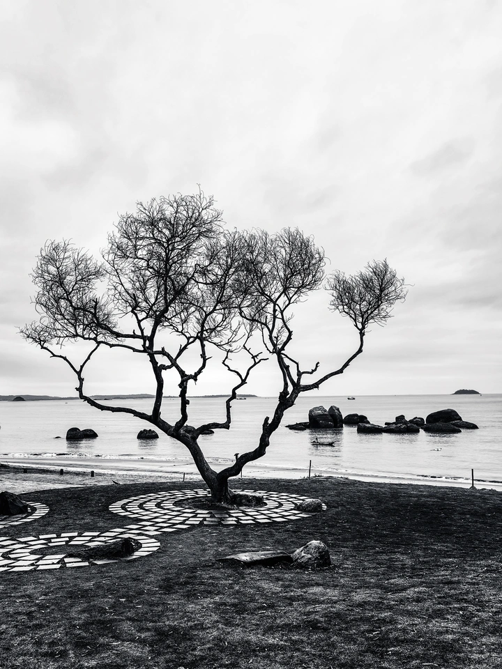 阴天来到海边,没有蓝蓝的天,不似往日般好看。就用黑白色表现吧。看看浪花,看看脚印,看看退潮留下的沟壑,看看海边的树。。。