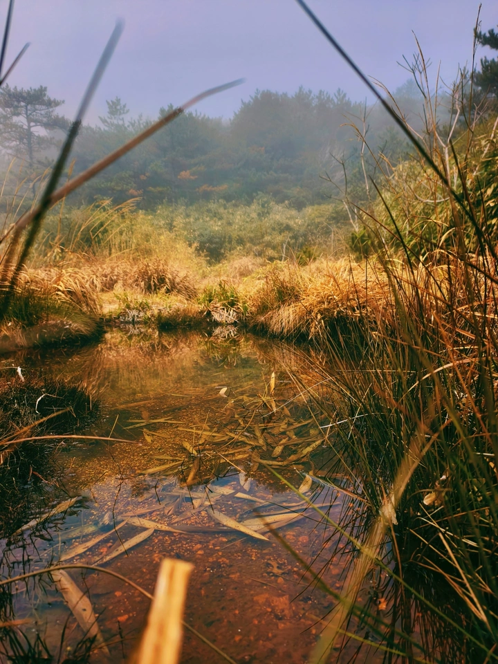 清晨的山雾漫过草甸,把山野揉成了一幅温柔的油画。 浅溪里沉着枯黄的草叶,像时间落下的信笺。清透的水面映着雾霭里的绿意,风掠过草尖时,连呼吸都跟着轻了。在这里不用追赶什么,蹲下来看水纹漫过石子,就接住了整个山野的松弛感。