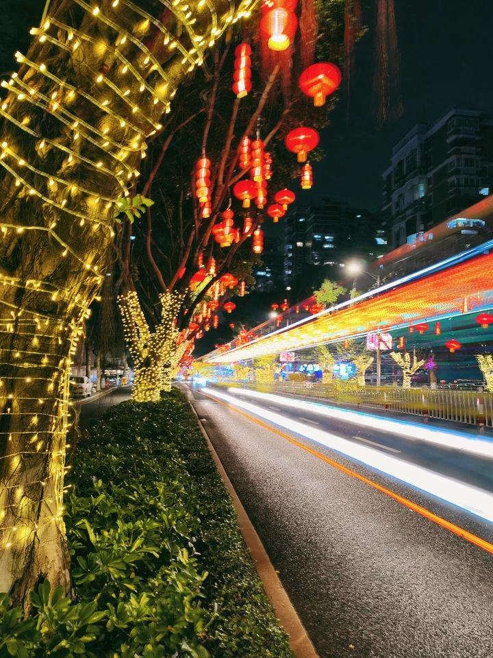 车灯在柏油路上织成流动的星河,红灯笼与暖黄灯串在枝头相拥。这是城市独有的浪漫仪式,将烟火气揉进流光里。 手机定格下此刻的鲜活,让飞驰的光轨与温柔的灯海,都成为马年最动人的序章。