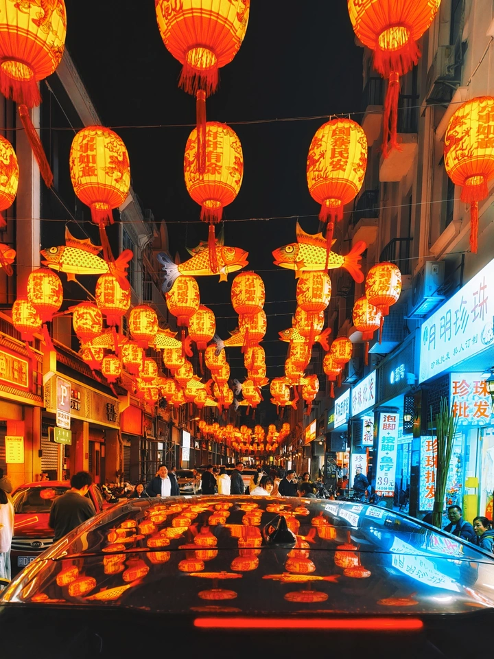 红灯笼织就的穹顶之下,暖红与冷蓝撞出极致的视觉张力。鱼灯凌空游动,光影在车身上铺展成流动的诗,行人成了画中最生动的笔触。这是属于城市的年味美学,热烈又治愈,每一帧都是对传统最浪漫的注脚,定格下此刻独有的烟火与璀璨。