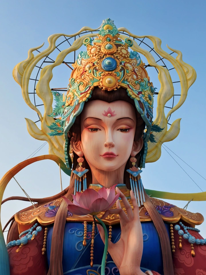 【白昼:清辉凝玉,见风骨】 白日里的妈祖,是褪去华灯后的沉静与庄严。日光为她加冕,宝冠的鎏金在晴空下泛着温润的光,红蓝衣袂的纹理清晰可见,每一缕飘带都透着东方美学的细腻肌理。她立于碧波祥云间,眉目低垂,手持莲华,似一位温柔的守望者,将闽南人对海的敬畏,凝在每一寸素净的光影里,风骨凛然,自带慈悲气场。 【夜幕:灯火入梦,显神颜】 当夜色漫过园博苑,妈祖灯便活了过来。千万盏灯珠点亮金身,宝冠流光溢彩,衣袂被光影染得愈发瑰丽,祥云与海浪灯组交相辉映,宛若星河坠于人间。她不再是静默的雕塑,而是踏光而来的海神,目光所及,皆是平安。这一刻,灯火是她的羽翼,温柔又磅礴,把千年的祈愿都化作了触手可及的璀璨。