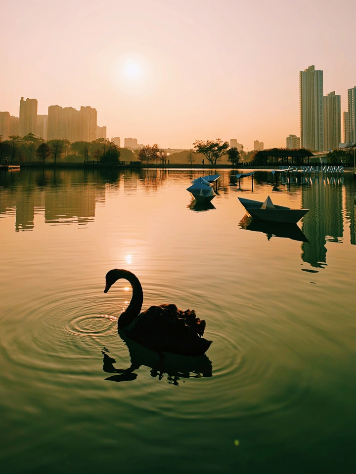 夕阳为湖面镀上一层碎金,黑天鹅们划着红掌,在粼粼波光里悠游。纸船在远处随波轻晃,像是谁遗落的温柔心事。 时间在这里慢了下来,唯有天鹅的剪影与落日的余晖,共同织就着这黄昏独有的浪漫。